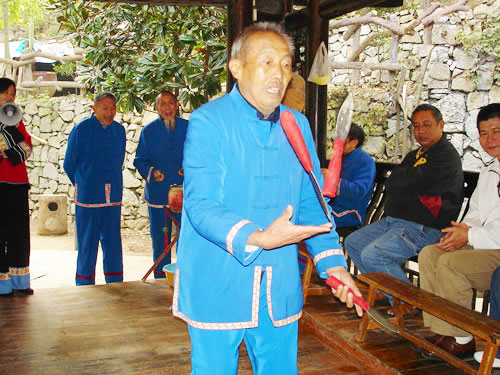 三棒鼓,唐代稱三仗鼓,約于明代傳入張家界,并逐漸成為群眾喜聞樂見的民間藝術(shù)形式。每年春節(jié),藝人們結(jié)伴走村串寨拜年,表現(xiàn)對象不分貧富,戶戶必到。如遇貧寒之家,表演者將別家贈送的禮品相送,意在人人過節(jié)歡喜。充分體現(xiàn)出土家人熱情好客,心地善良的民族性格。對加強民族間團結(jié)有一定的作用。三棒鼓 通常由三至五人組成,一人擊鼓唱詞,一人鑼鼓配樂,一人;ò;ò羧,長一尺,舞者左右 各執(zhí)一根,將另一根拋在空中,左右開弓,擊打空中花棒使之不落地。也有以刀代棒,以五刀代三棒的技藝。鋼刀在空中歡跳,銀光閃閃,左右穿梭。技藝高強者,突然把刀拋得及高,來一個騰空飛腳,轉(zhuǎn)身外擺,繼續(xù)接刀上拋,令人眼花繚亂,不禁稱絕。打三棒鼓,通常有“鬧春耕”、“收割打場”、“慶豐收”、“拜年節(jié)”四套,分“鯉魚跳龍門”、“玉女穿梭”、“板巖漂灘”等項目。打三棒鼓技巧性強,表演時需高度集中,用力適當,貫通一氣,并與演唱者默契配合。