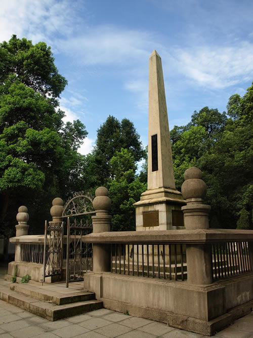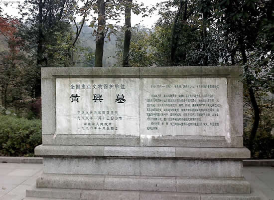 在岳麓山上。墓由三層臺階百余級踏步導(dǎo)入,墓碑為一四棱形的整塊4乳白色巖石琢成,全高約10米,因地處岳麓山高峰開闊處,顯得格外聳拔、挺秀、眺望湘江江,長沙景物盡入眼底。黃光(1874—1916),朱名軫,號杞園,又號克強(qiáng),湖南善化(今長沙)人,辛亥革命重要領(lǐng)導(dǎo)人,史有“孫黃”之稱。1904年組織華興會,翌年8月與孫中山、章太炎等人組織中國同盟會,曾生動并領(lǐng)導(dǎo)欽州、廉州(治今廣西合浦)、鎮(zhèn)獻(xiàn)花(今友誼關(guān))、河口、廣州等地區(qū)反清戰(zhàn)役起義,任民軍戰(zhàn)時(shí)總司令。南京臨時(shí)政府成立,任陸軍總長。袁世凱稱帝后,任討袁軍總司令。1914年赴美醫(yī)病,1916年病重回國,10月31日于上海病故,時(shí)年43歲,次年移柩長沙,國葬于岳麓山。為全國重點(diǎn)文物保護(hù)單位。