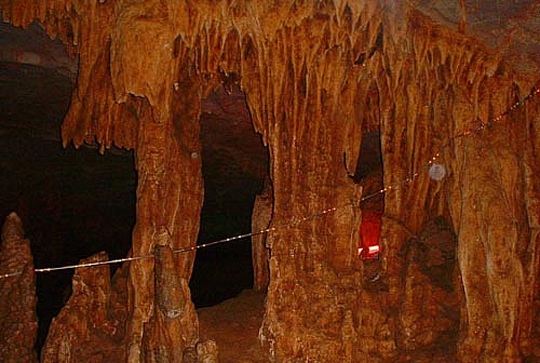 | 藏君洞為一大型天然溶洞,溶洞長25000米,已探明洞長4000m,洞內(nèi)洞中有洞、洞中有河,迂回曲折,地下河流水潺潺,溶洞分布在石炭系中、上統(tǒng)碳酸鹽巖中,洞內(nèi)鐘乳石十分豐富:石筍、石柱、石幔、石樓、石像比比皆是。洞內(nèi)構(gòu)造奇特,石鐘乳千姿百態(tài)、絢麗多彩,景觀奇秀,珍品奇絕,是我國少有的大型碳酸鹽巖巖溶洞穴之一。目前已開發(fā)的4000m洞穴中,由十二個大的溶洞群構(gòu)成,由洞口往里有護(hù)君堂、惠帝殿、兩重天、南巡廳、不夜城、龍鳳宮、北國廳、江南廳、江河壩、閱兵場、國寶廳等溶洞景觀區(qū)。溶洞一般高5~30m,長60~100m,寬10~20m,面積60~200㎡。十二個溶洞沿地下河呈串球狀分布,洞與洞之間有巷道(地下河管道)相連,溶洞中景觀十分豐富,仿佛是一個瑰麗的地下宮殿。如護(hù)君堂內(nèi)有“尚書帽”、“御馬”、“貓頭鷹”、“小羊羔”、“老夫妻”、“天宮浴盆”等景點(diǎn),惠帝殿內(nèi)由“斷劍石”、“龍椅”、“觀音立佛”、“觀音蓮花寶座”等,“蔬果長廊”中有形似花菜、白菜、絲瓜、茄子、黃瓜等石筍,不夜城內(nèi)有乳白色石鐘乳巖溶坡面,龍鳳宮內(nèi)有石幔、石柱琳瑯滿目及鐘乳石構(gòu)成的似漢白玉“龍鳳石床”、“旭日東升”的浮雕石鐘乳墻、“燈籠群”、“攀龍柱”、“石蓮花”等,國寶廳巨型石柱等,巷道側(cè)壁唐僧師徒“西天取經(jīng)”壁畫等,景觀類型齊全,是巖溶洞穴中具有典型地學(xué)意義的巖溶地貌景觀,屬國家級的地質(zhì)遺跡景觀。