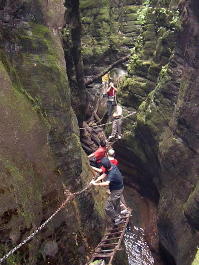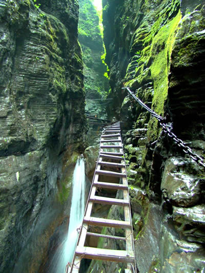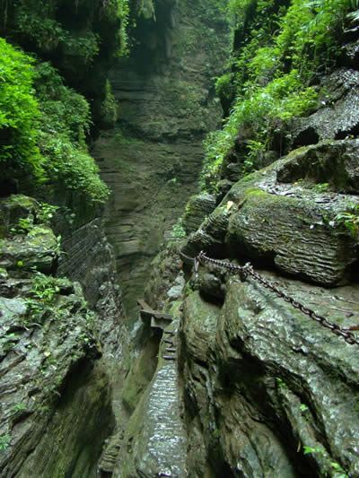 坐龍峽風(fēng)景區(qū) 坐龍峽擁有中國第一條特種游道。所有游道均建于峽谷深處,依山取勢,既經(jīng)細(xì)心雕琢聽卻又渾然天成。粗樸的板栗木棧道,可以讓你零距離的親近那一潭碧幽、聽聞山泉叮咚;精巧的跳墩,可以讓你媳戲流泉、觸感溪瀑;原質(zhì)的石坎道,讓你不得不調(diào)動(dòng)全部的身心能量悉心攀援、感悟峽谷;有驚無險(xiǎn)的鐵梯,讓你伴著腳下轟鳴的溪水,在驚怵中體味一份快慰。出口處的土家山寨,保留了古樸獨(dú)特的生活習(xí)俗。一塊臘肉就一口醇香的“苞谷燒”會(huì)讓你洗去所有的疲憊,在輕松中憨厚的主人向你講述過去強(qiáng)人出沒的故事......