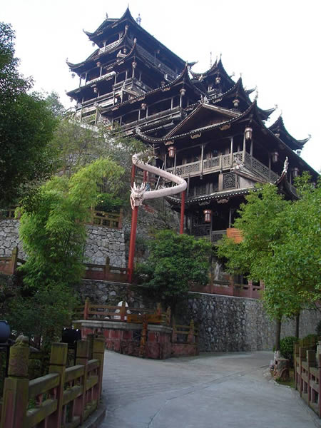 九重天 九重天世襲堂是土家風(fēng)情園的精華和靈魂所在。該建筑由土家民間藝人李宏進(jìn)設(shè)計(jì),依80度陡坡而建,高48米,共9重12層,整個(gè)樓房全部用木栓連接,沒有一顆鐵釘,堪稱土家族建筑史上的奇跡。2002年9 月22日,九重天吊腳樓被載入世界吉尼斯世界紀(jì)錄,認(rèn)定其為目前中國最大、最高、最完美的木質(zhì)結(jié)構(gòu)吊腳樓。2001年4月6日,朱镕基總理視察土家風(fēng)情園時(shí),對(duì)九重天贊不絕口:“一批民間匠人能造出這樣輝煌的吊腳樓,而且還解決了力學(xué)的問題,真是不簡單!鼻迦A大學(xué)著名建筑學(xué)家何重義先生說:“張家界土家風(fēng)情園完全可以和蘇州的園林相媲美。特別是九重天世襲堂,猶如玉宇瓊閣,令人神往!”古人說,天有九野,地有九州,土有九山,山有九寨。古人又把九重叫做天,說天有九重,最上一重是上帝和君主居住的地方,所以我們叫它“九重天”。