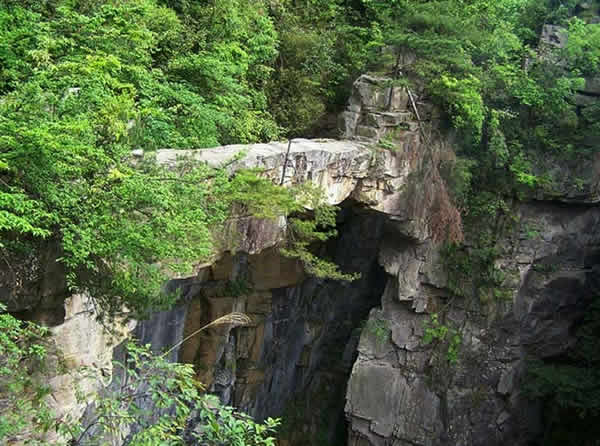 仙人橋又稱天下第一橋,坐落在猴子坡上、天子峰下的王爺洞對面。橋?qū)僮匀恍纬,長26米,寬1.5米,厚一米多,高約六七十 米,飛架在兩岸懸崖絕壁之上,鬼斧神工,惟妙惟肖,古人云:“天地可掬,此真天造也”。仙人橋為紅砂巖結(jié)構(gòu),兩端生有高大的黃山松和杜鵑樹,濃蔭掩映,極其美麗。橋的東頭還有自然形成的石級,人可順石級而下,走上天橋,下視萬丈深淵,令人頭暈?zāi)垦,非健壯者不敢逾越,旅游者無不贊嘆,說它是“天下絕景”。