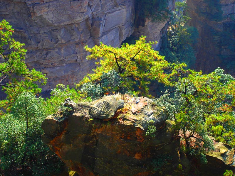 與袁家界后花園觀景臺(tái)遙遙相對(duì)。海拔949米,相對(duì)高度400多米,頂部面積3公頃。因野山羊多而得名。整座石峰,東、西、南三面皆絕壁,唯北面一徑可上。頂部為一平緩的狹長(zhǎng)石梁,長(zhǎng)近500米,寬20~30米,呈東西向,布滿原始次生林。向西伸出三道小石梁,長(zhǎng)10~20米,寬2~3米,前沿皆是高危奇絕的凌空觀景臺(tái)。立臺(tái)上,仿佛置身云端,鳥(niǎo)瞰金鞭溪、舍刀溝,宛如絲帶隱現(xiàn)于峰谷綠叢中。放眼四圍,千百座石峰,環(huán)列足下,浩浩蕩蕩,如劍朝森列,如將軍布陣,如古塔競(jìng)姿。西面7對(duì)石峰似七對(duì)情侶,男俯女仰,對(duì)面而立。民國(guó)年間,此寨是土匪巢穴,留有卡門(mén)、殘堡、斷壕、屋場(chǎng)、水井、破臼、磨坊等殘跡。 |
