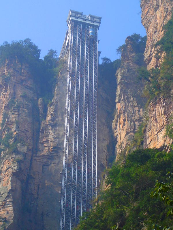 百龍?zhí)焯荩怪备卟?35米,運(yùn)行高度326米,由154米山體內(nèi)堅(jiān)井和172米貼山鋼結(jié)構(gòu)井架等組成,采用三臺(tái)雙層全暴露觀光電梯并列分體運(yùn)行,每臺(tái)次載客50人次,運(yùn)行速度3米/秒,三臺(tái)同時(shí)運(yùn)行每小時(shí)往返量達(dá)4000人次。百龍?zhí)焯莸男藿▽?shí)現(xiàn)“山上游,山下住”的目標(biāo),提供了交通保障,將袁家界天下第一橋、迷魂臺(tái)、天懸白練以及烏龍寨、楊家界等絕世美景從幕后推向了前臺(tái),并將天子山、袁家界、金鞭溪等精品旅游線路連為一體,解決了多年困擾景區(qū)的交通瓶頸問(wèn)題。