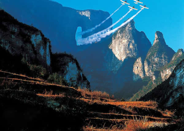 天門洞風(fēng)光圖片 天門洞景觀 1700多年來(lái),這一道奇絕天下的勝景吸引著無(wú)數(shù)的探訪者趨之若鶩。特別是在1999年,世界特技飛行大師駕機(jī)穿越天門洞,在全球引發(fā)了轟動(dòng)效應(yīng),收看現(xiàn)場(chǎng)直播的觀眾達(dá)到8億之多。