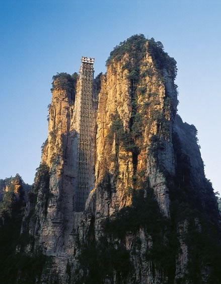 百龍?zhí)焯輬D片 2005年4月8日,張家界百龍?zhí)焯萑?hào)電梯通過驗(yàn)收正式投入運(yùn)營(yíng),這標(biāo)志著張家界核心景區(qū)旅游黃金周首條游客無須排隊(duì)通道誕生.。隨著張家界對(duì)景區(qū)核心袁家界的深度開發(fā)和金鞭溪與賀龍公園兩條紅色旅游線路的確立,選擇從金鞭溪乘百龍?zhí)焯萸巴医缂疤熳由劫R龍公園觀景的游客將越來越多,百龍?zhí)焯萑?hào)電梯開通后,它可為游客提供更可靠的交通保障,它將天子山、金鞭溪等精品游覽線連為一體,解決了多年困擾景區(qū)的交通瓶頸問題。游客乘百龍?zhí)焯,只要?jīng)過1分58秒鐘,便仿佛進(jìn)入如詩如畫的天上人間,欣賞有張家界“后花園”之稱的袁家界大峰林神奇美景。