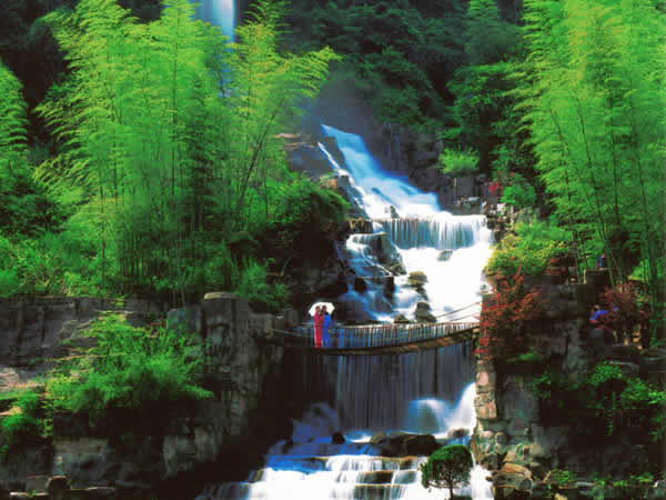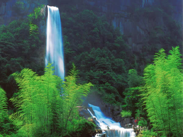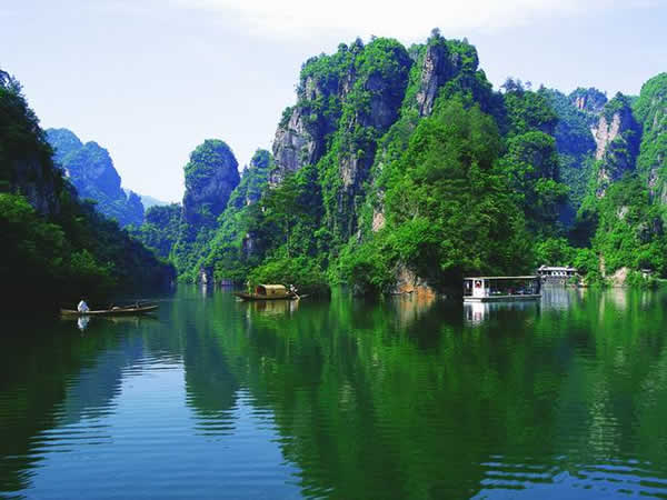 寶峰湖瀑布 湖中有兩座疊翠小島,近岸奇峰屹立,峰回水轉(zhuǎn)。泛舟漫游,只見一湖綠水半湖倒影,充滿詩情畫意。“云梯萬丈上天臺,高峽平湖一鑒開,王母瑤池金扶,浣沙仙女下凡來”游寶峰湖,你就會欣賞到這樣的詩情畫意。群峰擁抱的寶峰湖,長約2.,5公里,湖猶如一面寶鏡,四面青山,一泓碧水,蕩槳溫游,格外愜意。坐在船上,環(huán)顧四周,千山聳翠,俯視水中,倒影慢移,碧水照相館得群峰綠,人面桃花水映紅。真是靜極了,美極了!韓劇《九天洞》拍攝的湖水就是寶峰湖。