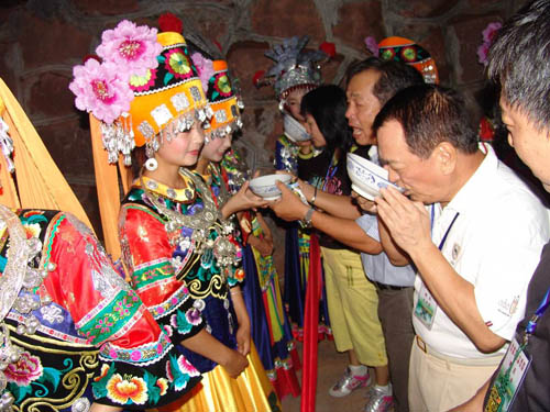 祝賀詞和答謝詞之后,主人把早已想好了的農(nóng)事或家事其日常生活的要事向來客提問,接謝人隨問隨答,然后由族長十分恭敬地雙手舉起盛滿包谷酒的酒杯,遞給一個年長客人,一碗一碗地讓客人們喝下這香醇美的包谷燒酒。一切儀式做完之后,說聲:“得罪了,最尊貴的客人”,客人答一聲“請不要客氣,我們都是一家人”。這時,酒門大開,攔門人很禮貌地讓開一條道路恭迎客人進(jìn)屋。