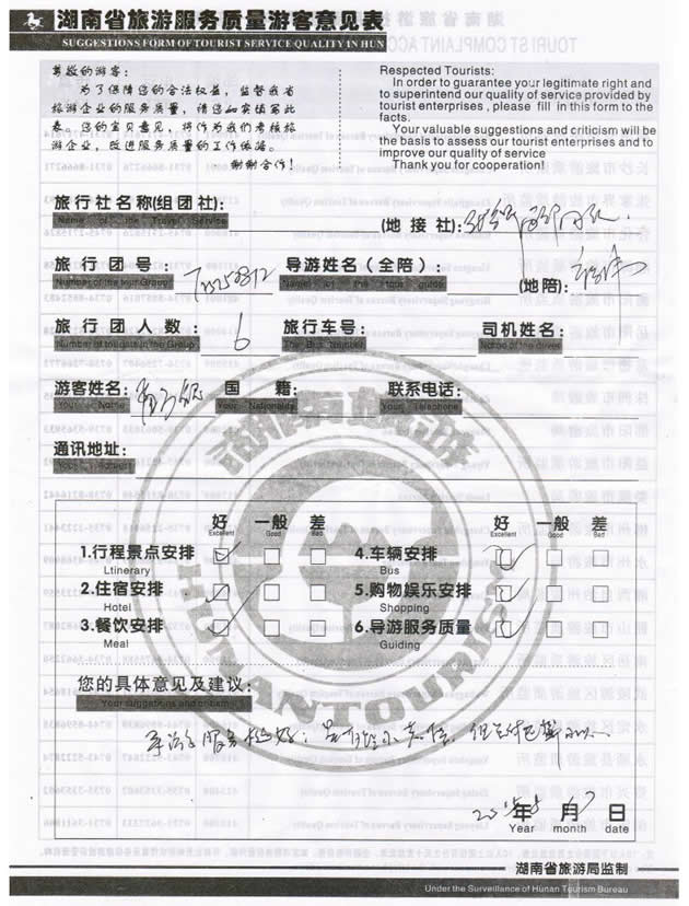 8月初,山西太原孟先生一行6位貴賓與湖南西部(張家界)中國國際旅行社工作人員——小吳取得聯(lián)系,經(jīng)過商談,雙方達成協(xié)議并簽訂旅游合同,于8月14日抵達張家界,開始張家界之旅。此次行程是由我社優(yōu)秀導(dǎo)游——褚偉負責(zé)旅游接待工作,褚導(dǎo)在旅游過程中講解詳細,客人也很滿意,在意見表上寫道:導(dǎo)游服務(wù)挺好,謝謝周先生。同時也感謝周先生選擇湖南西部(張家界)中國國際旅行社,以及您對湖南西部國旅的信任與支持。我們會繼續(xù)努力,做好旅游接待工作。期待下一次與您的合作,祝您愉快!