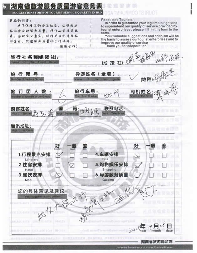 5月份,臺灣趙女士一行6位貴賓與湖南西部(張家界)中國國際旅行社工作人員——小龔取得聯(lián)系,經(jīng)過商談,雙方達成協(xié)議并簽訂旅游合同,于9月12日抵達張家界,開始張家界之旅。此次行程是由我社優(yōu)秀導(dǎo)游——張杰負責(zé)旅游接待工作,張導(dǎo)在旅游過程中講解詳細,客人也很滿意,在意見表上寫道:此次大陸之行、張家界之旅、很滿意。同時也感謝趙女士一行貴賓選擇湖南西部(張家界)中國國際旅行社,以及您對湖南西部國旅的信任與支持。我們會繼續(xù)努力,做好旅游接待工作。期待下一次與您的合作,祝您愉快!