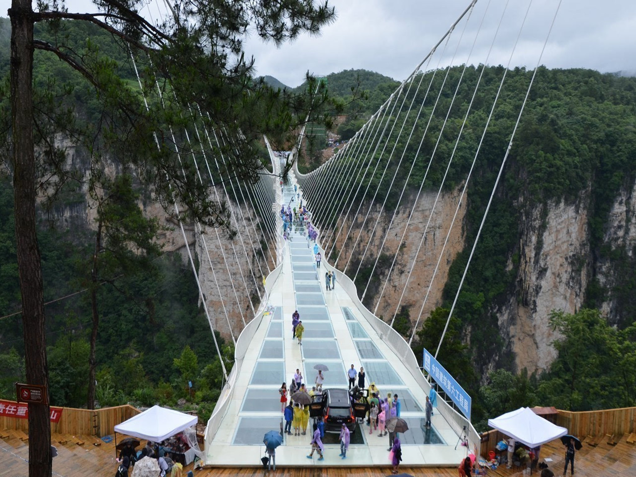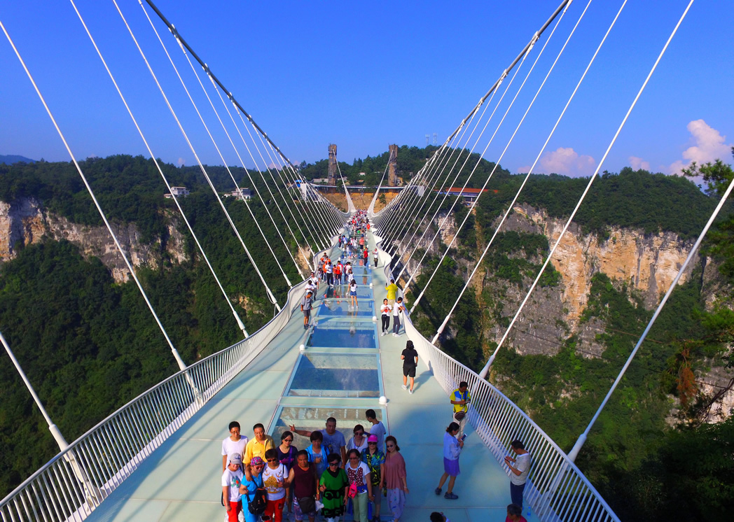 張家界大峽谷玻璃橋位于湖南省的張家界大峽谷景區(qū)栗樹埡和吳王坡區(qū)域內,為一座景觀橋梁,兼具景區(qū)行人通行、游覽、蹦極、溜索、T臺等功能。主跨430米,一跨過峽谷,橋面長375米,寬6米,橋面距谷底相對高度約300米。這座全透明玻璃橋長度、高度位居世界第一。