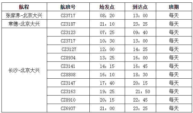 南航冬春換季后還全面優(yōu)化了各地往返北京大興的航線網絡。其中,張家界至北京大興航班為每天一班的朝發(fā)夕歸航班,去程CZ3717(張家界-大興)航班08:20張家界出港,回程CZ3164(大興-張家界)航班17:50北京大興起飛,時刻非常方便出行,張家界始發(fā)至大興單程僅450元起(不含稅)。常德每天往返北京大興1班;長沙每天往返大興10班(2班為寬體機),均提供“精品航線”服務。此外,北京大興往返廣州、深圳、上海、長沙、貴陽、珠海、海口、三亞、哈爾濱、大連、杭州、重慶、西安、烏魯木齊等全國主要城市均為早中晚全天候航班布局,方便旅客航空出行和中轉銜接。